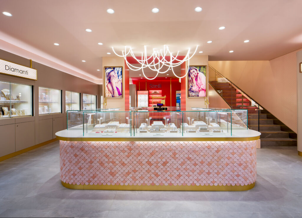 Lo spazio è stato progettato dallo studio italiano Thirtyone Design+Management, fondato nel 2015 da Claudia Campone: un concept esclusivo pensato per riflettere i valori del marchio – stile, design e qualità Made in Italy – e realizzato per esaltare al meglio le collezioni Stroili. La boutique ospita infatti le linee dedicate ai diamanti, all’oro e all’argento, oltre alle proposte di orologi. Non solo: in negozio sono presenti anche una serie di servizi esclusivi, come il corner per la personalizzazione dei gioielli e quello per l’ear piercing.