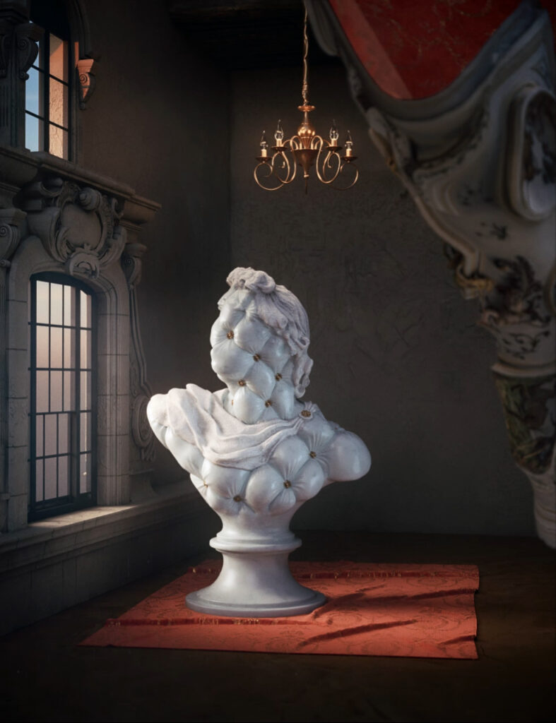 Monaghan ha trovato in Visionnaire il partner ideale per reinterpretare la celebre scultura di Apollo del Belvedere, attualmente nei Musei Vaticani a Roma: il busto, scolpito in marmo di Carrara a grandezza naturale, si ispira alla pelle capitonnè tipica del mondo dell’arredamento, unendo antichità e contemporaneità, con attento studio dei contrasti, morbidezza e durezza, virtuale e fisico, passato e futuro.
